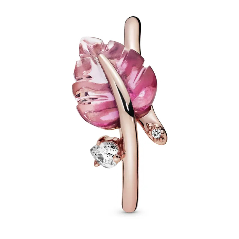 Выделяйтесь из толпы теплыми тонами и розовыми акцентами этого кольца с листьями из розового муранского стекла Pandora Rose (уникальное сочетание металла с покрытием из 14-каратного розового золота). Привлекательный розовый лист вырезан из уникального куска муранского стекла, а центр листа является продолжением кольца, придавая ему естественный вид. Вырезанный узор в виде листьев розы Pandora, расположенный под ней, пропускает дополнительный свет через стекло, а два особо прозрачных кубических циркония добавляют немного блеска.