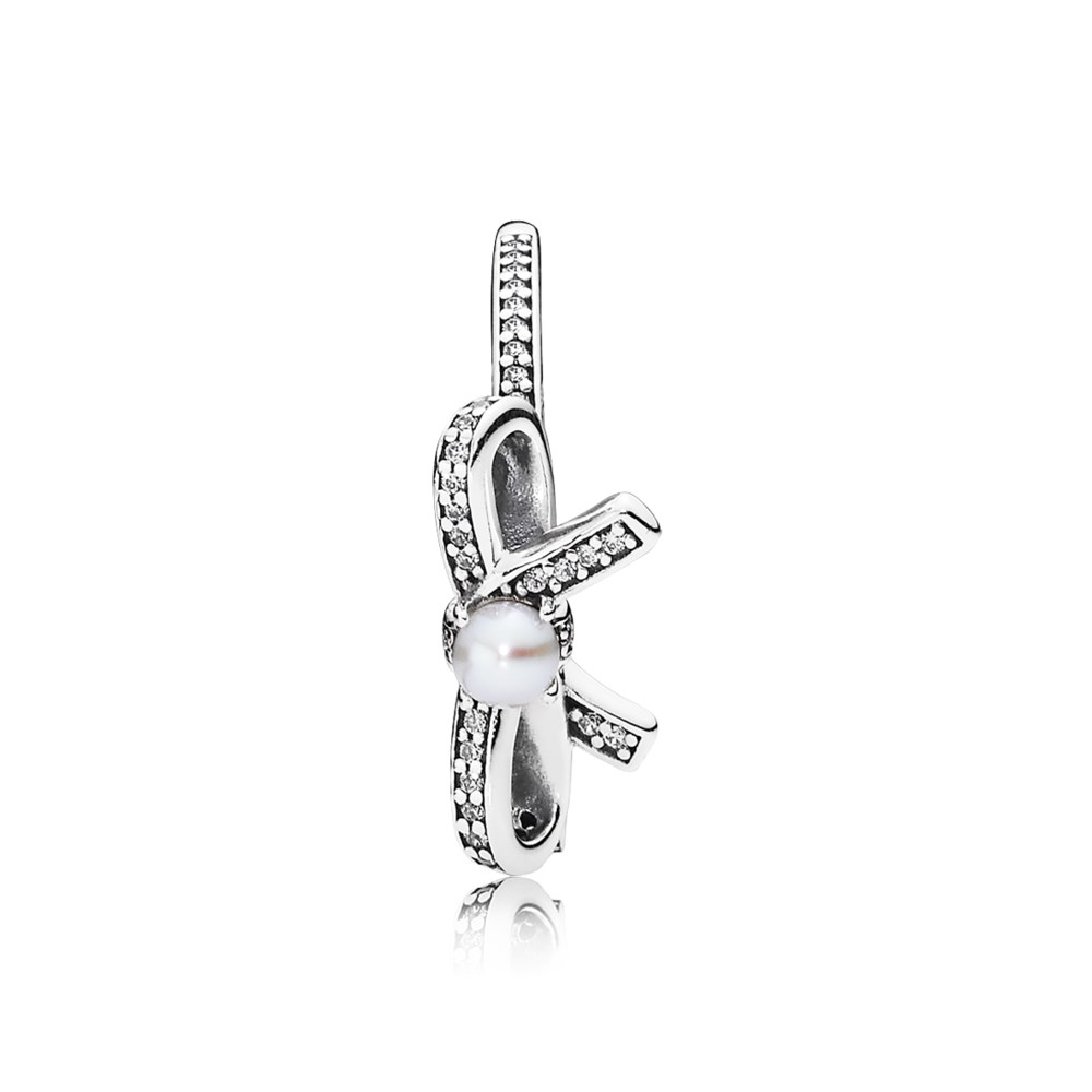 Кольцо из серебра с бантиком, белым пресноводным культивированным жемчугом и 46 кубическими циркониями.