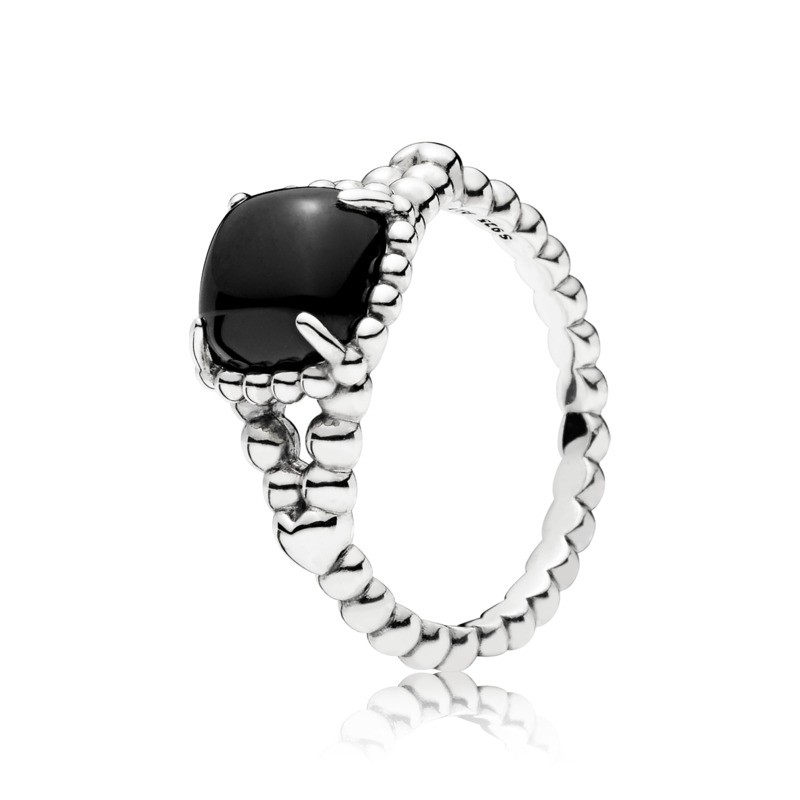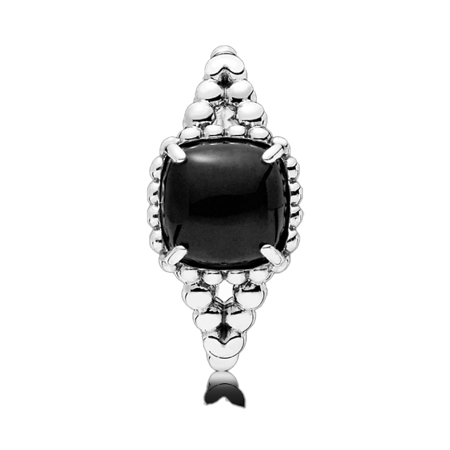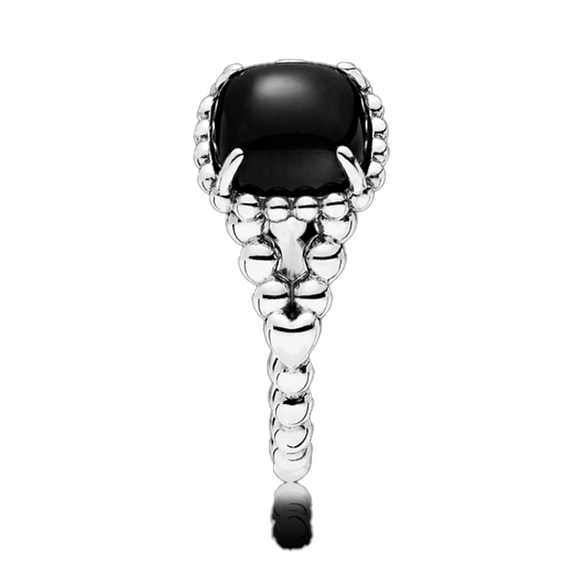 Это кольцо выполнено в бохо стиле: на его ободке, словно состоящем из множества бусин, располагается черный кубический цирконий в огранке кабошон. Особенно удачно оно смотрится в сочетании с серебряными украшениями в виде перьев.
