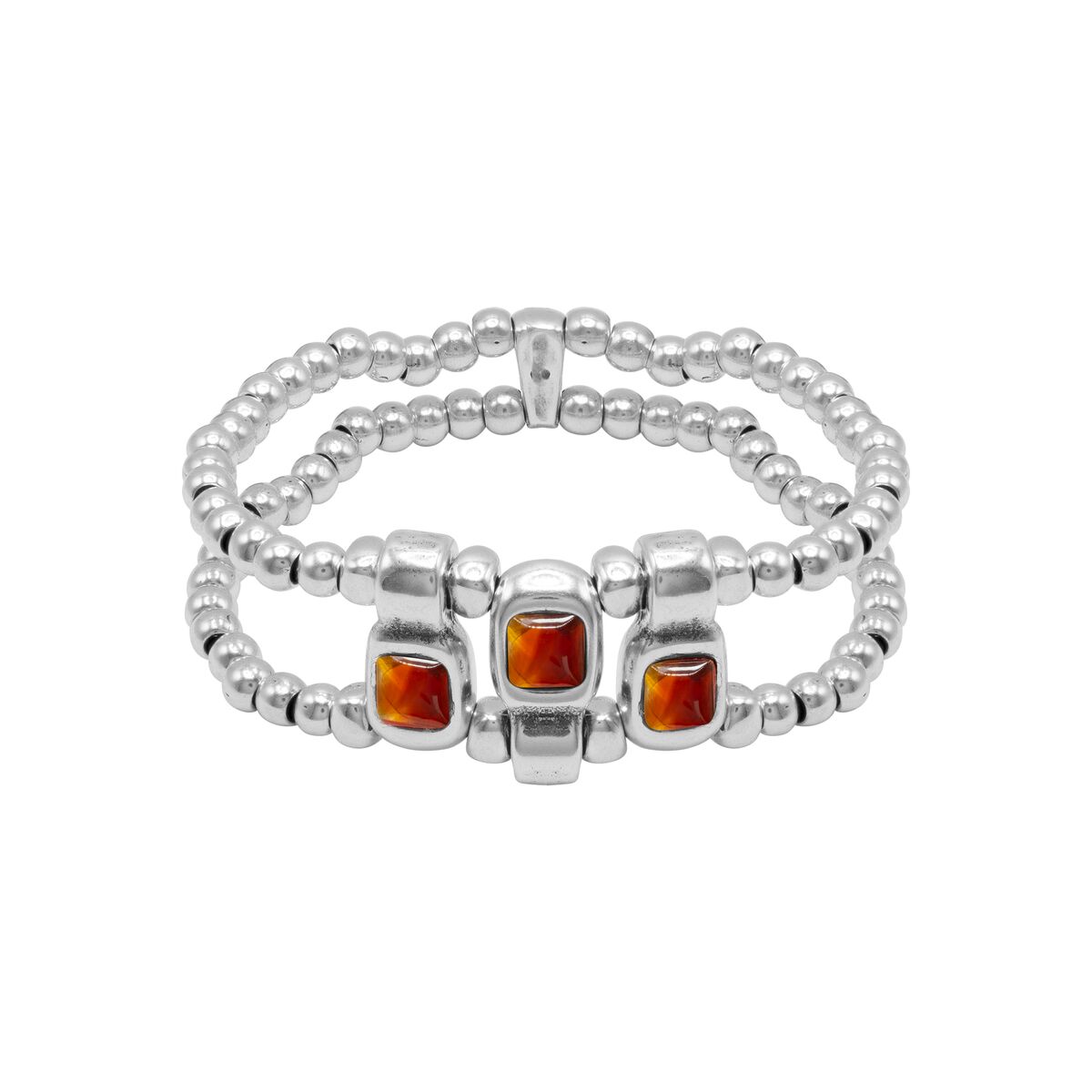 Изысканный двойной браслет, покрытый серебром, украшен маленькими шариками и тремя квадратными узорами в разных направлениях, дополненными тремя маленькими муранскими кристаллами.
