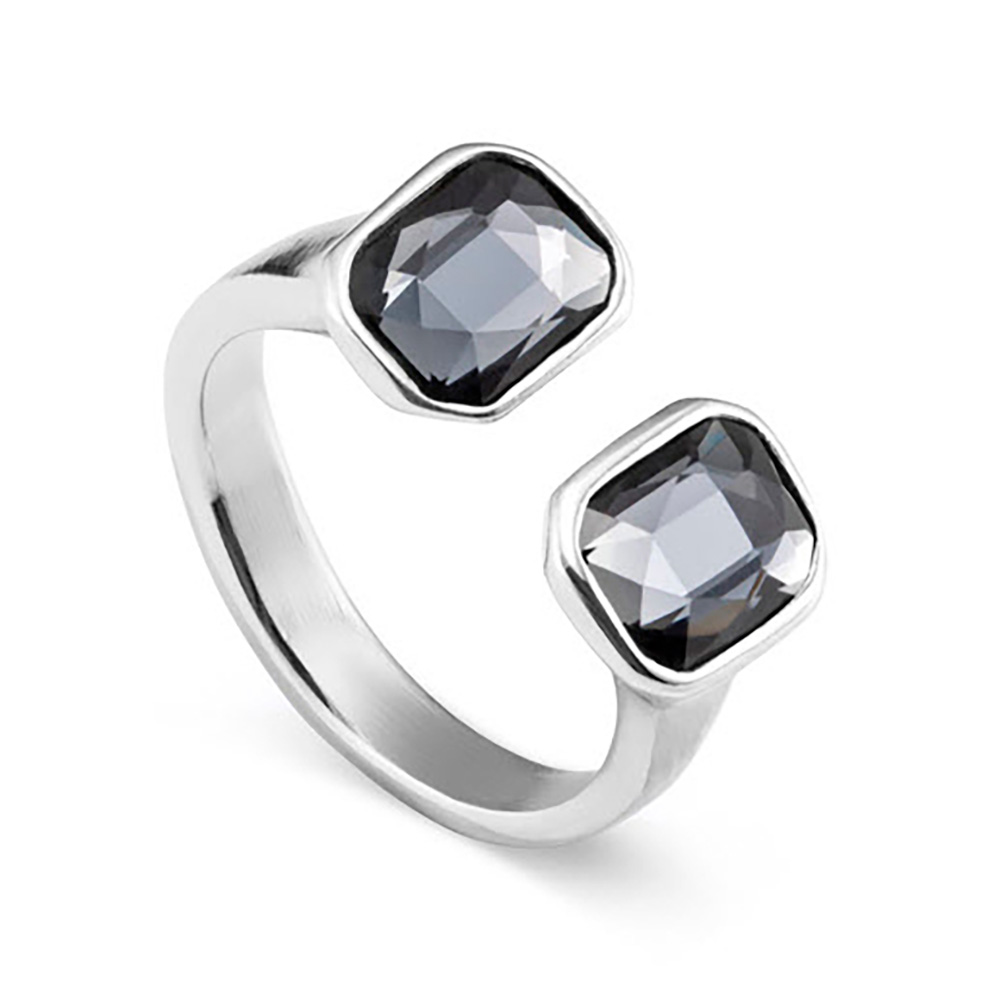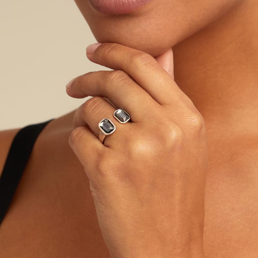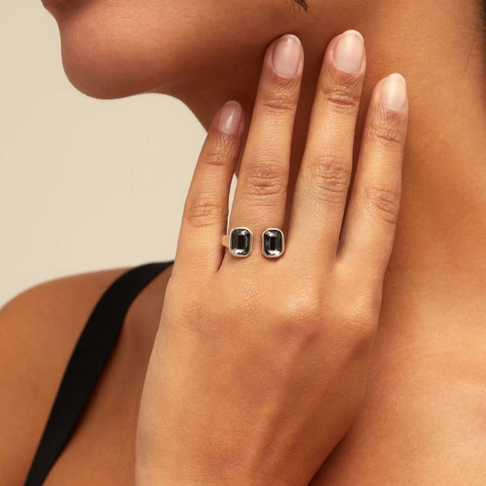 Открытое кольцо из ювелирного сплава с серебряным покрытием с двумя прямоугольными кристаллами цвета серебристой ночи.