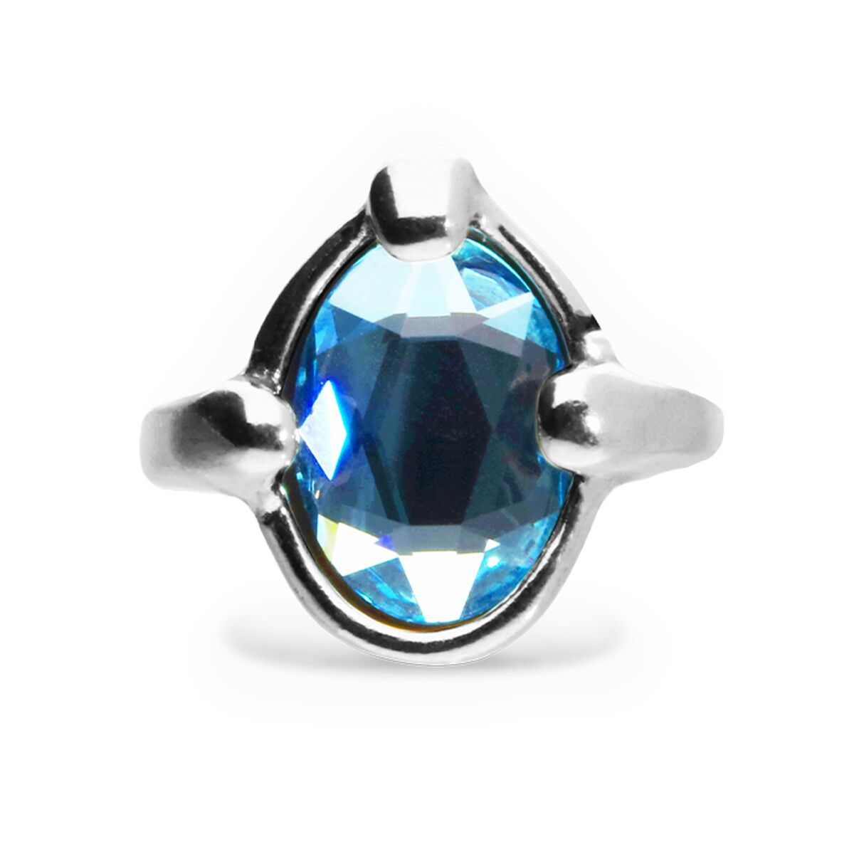 Это дизайнерское ювелирное изделие сочетает в себе прочность своей органической формы с глубоким сиянием ограненного кристалла спокойного оттенка синего.