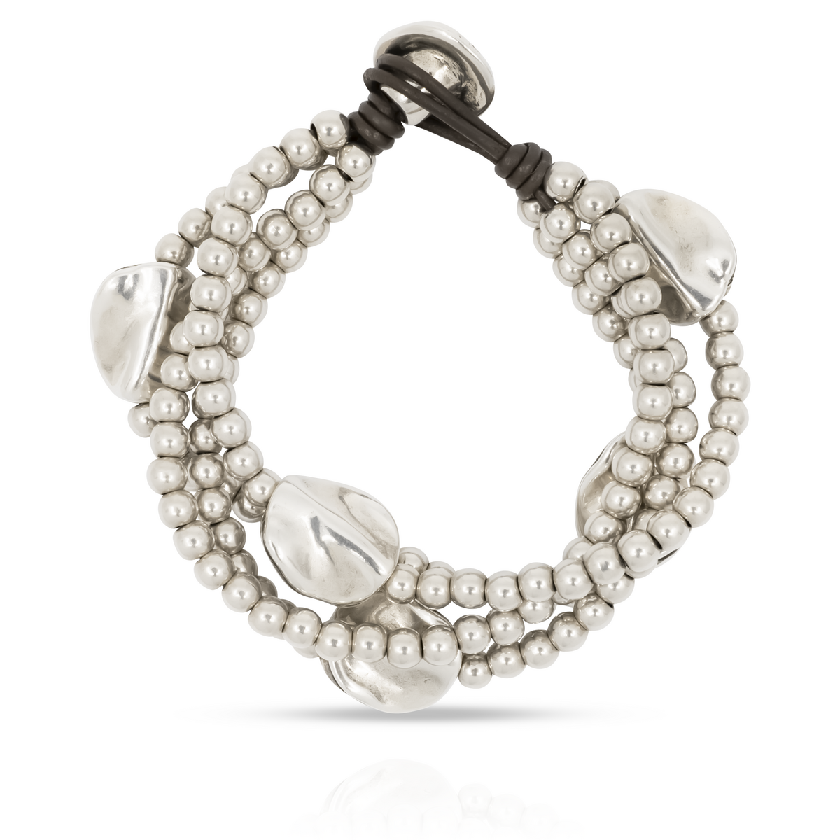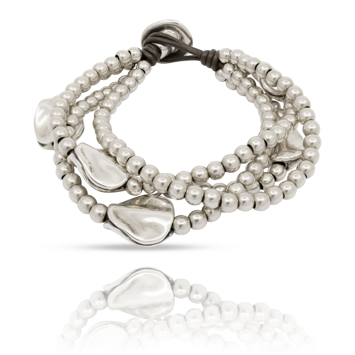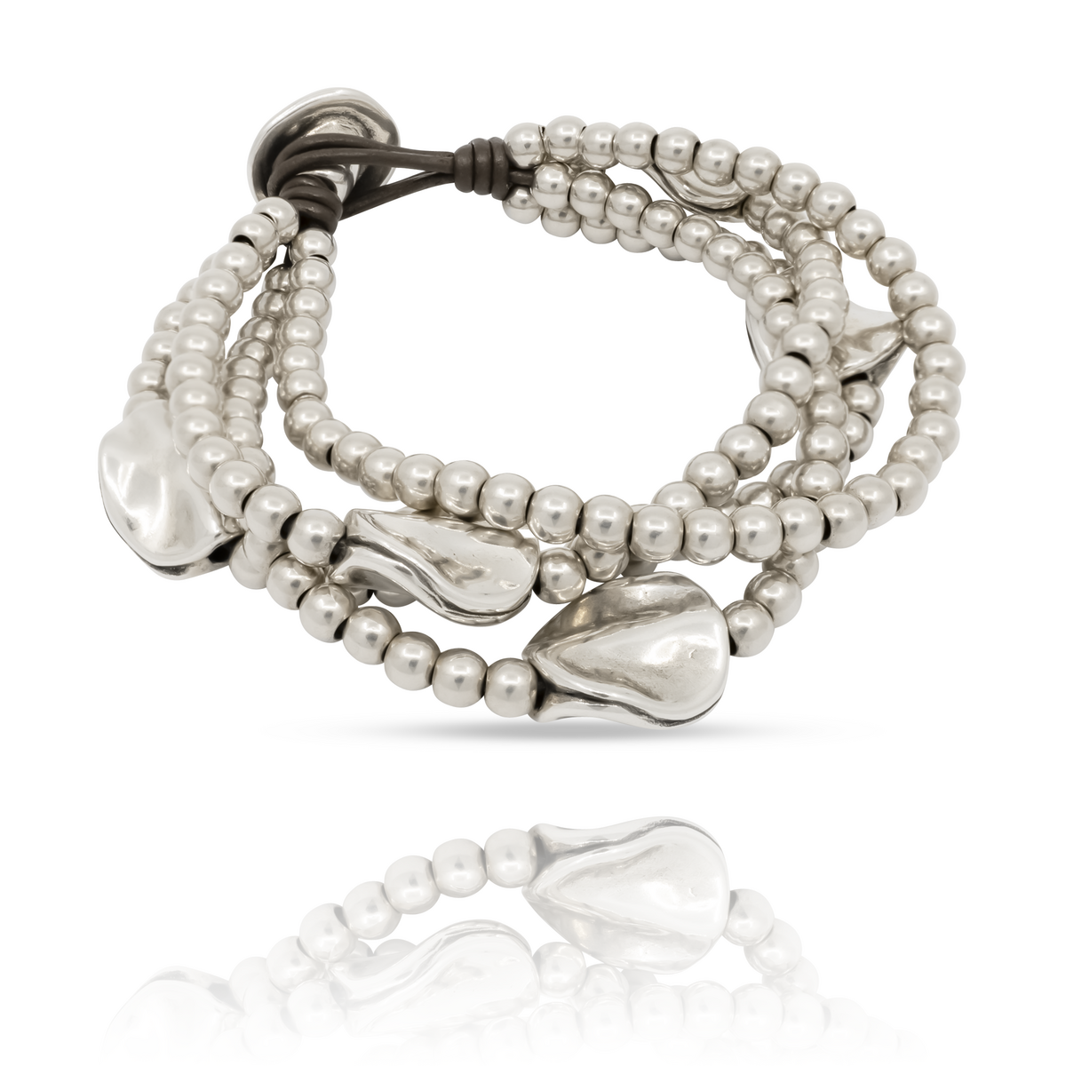 Женский браслет с несколькими рядами кожаных нитей и бусин, с застежкой из металлического сплава с серебряным покрытием. На застежке выгравирован логотип UNOde50.