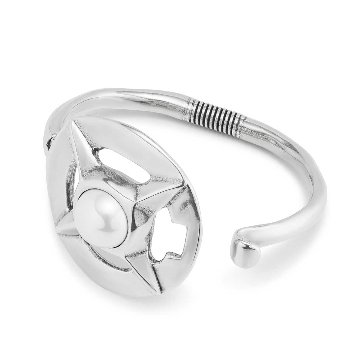 Ощутите гармонию, заключенную в браслете Crafted с серебром из коллекции CREATIVE. Изготовленный из уникального ювелирного сплава путем ручной работы аксессуар сочетает текучесть и несовершенность линий с идеальной формой крупной жемчужины. Камень заключен в оправу, напоминающую 4-конечную звезду, которая наложена на круг. Жесткий браслет благодаря пружине идеально садится на запястье. А эксклюзивный авторский дизайн сразу привлекает к себе внимание. Дополните браслет комплементарными серьгами арт. PEN0953BPLMTL0U, чтобы создать законченный образ.