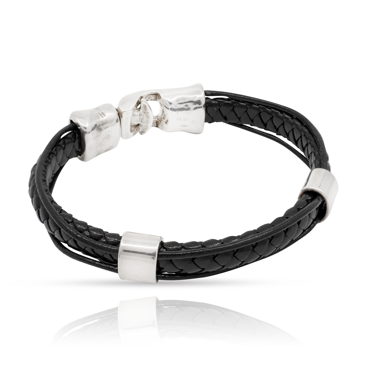 Сложный мужской браслет из плетеной кожи с двумя посеребренными металлическими вставками. Характерный дизайн от UNOde50, 100% ручная работа, Испания.