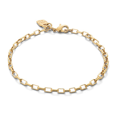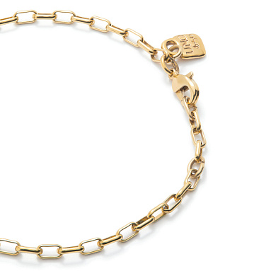 Классический браслет с золотом из коллекции Hazte Uno — универсальный аксессуар, способный украсить любой образ. Изделие ручной работы представляет собой цепочку, состоящую из перпендикулярных прямоугольных звеньев со скругленными углами. Благодаря интересной геометрии традиционное украшение приобретает актуальное звучание и привлекает внимание. Браслет изготовлен из уникального сплава с покрытием из 18-каратного золота. Фирменный замочек UNOde50, которым декорирована застежка-карабин, создает акцент и подчеркивает эксклюзивность украшения.
