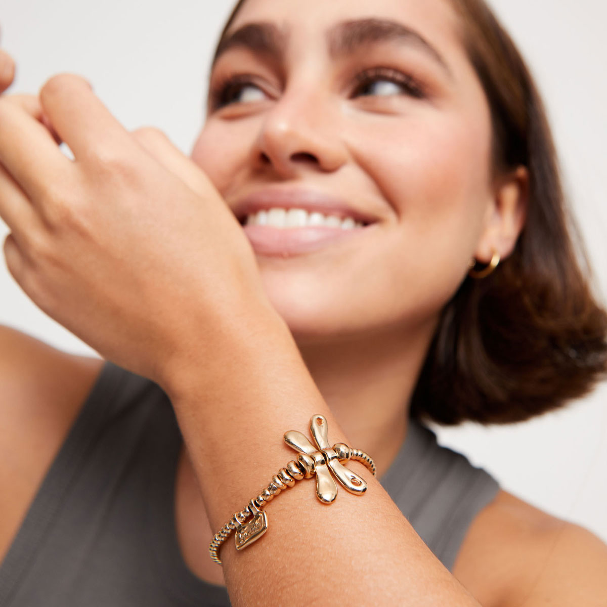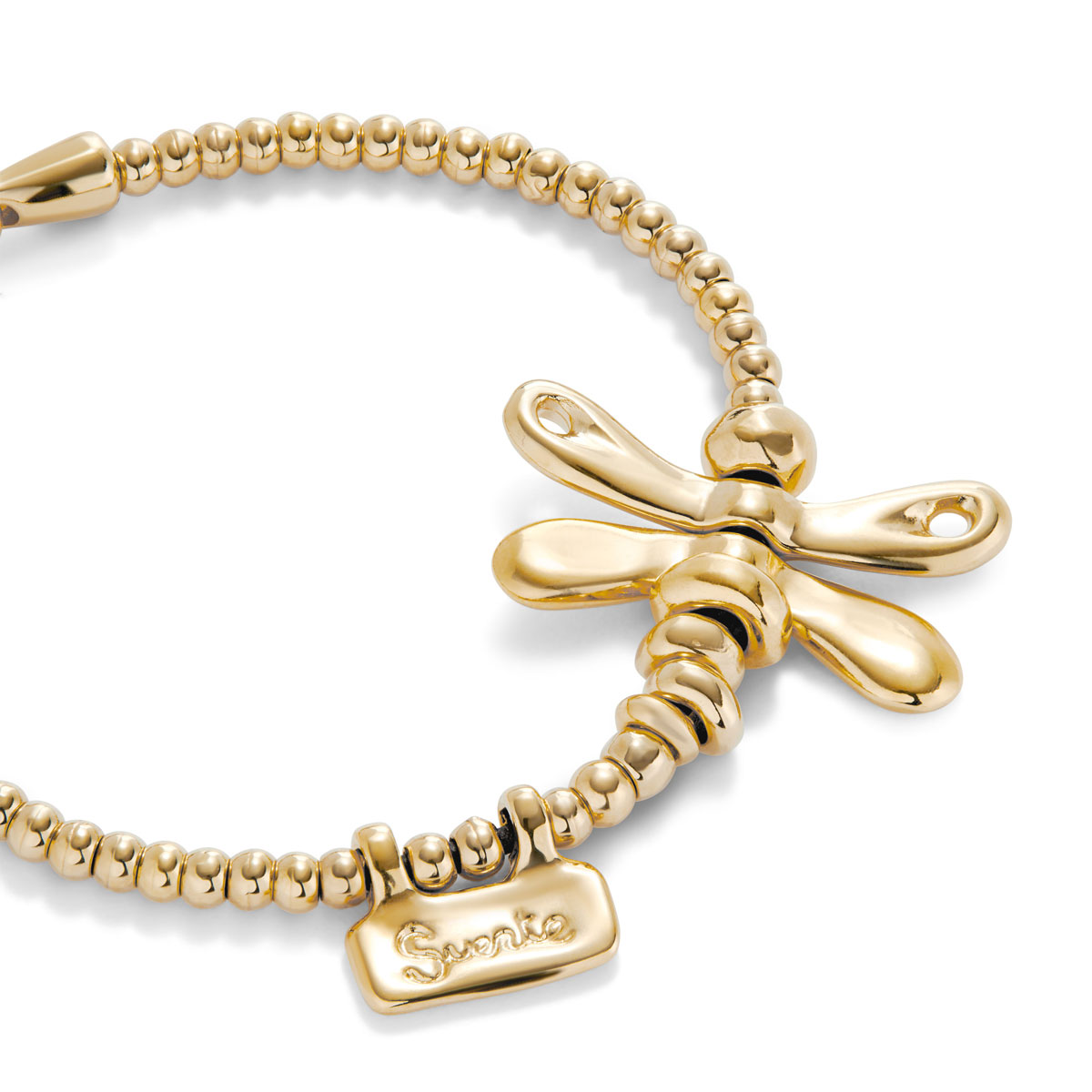Наслаждайтесь беззаботностью и ощущением легкости с эластичным браслетом со стрекозой, с золотом, из коллекции SER REBELDE. Изделие, выполненное из металлических бусин, венчает центральный элемент в виде стрекозы с распахнутыми крыльями. Дополнительным украшением является планка с гравировкой, которая может стать основой вашей ежедневной аффирмации, ведь нанесенное слово Suerte переводится с испанского как «удача». Надевая каждый день браслет, произносите: «Удача со мной» и будьте уверены, что она теперь сопровождает вас повсюду. Этот аксессуар ручной работы из уникального сплава станет не только впечатляющим украшением для любого образа, но и талисманом, приносящим везение.
