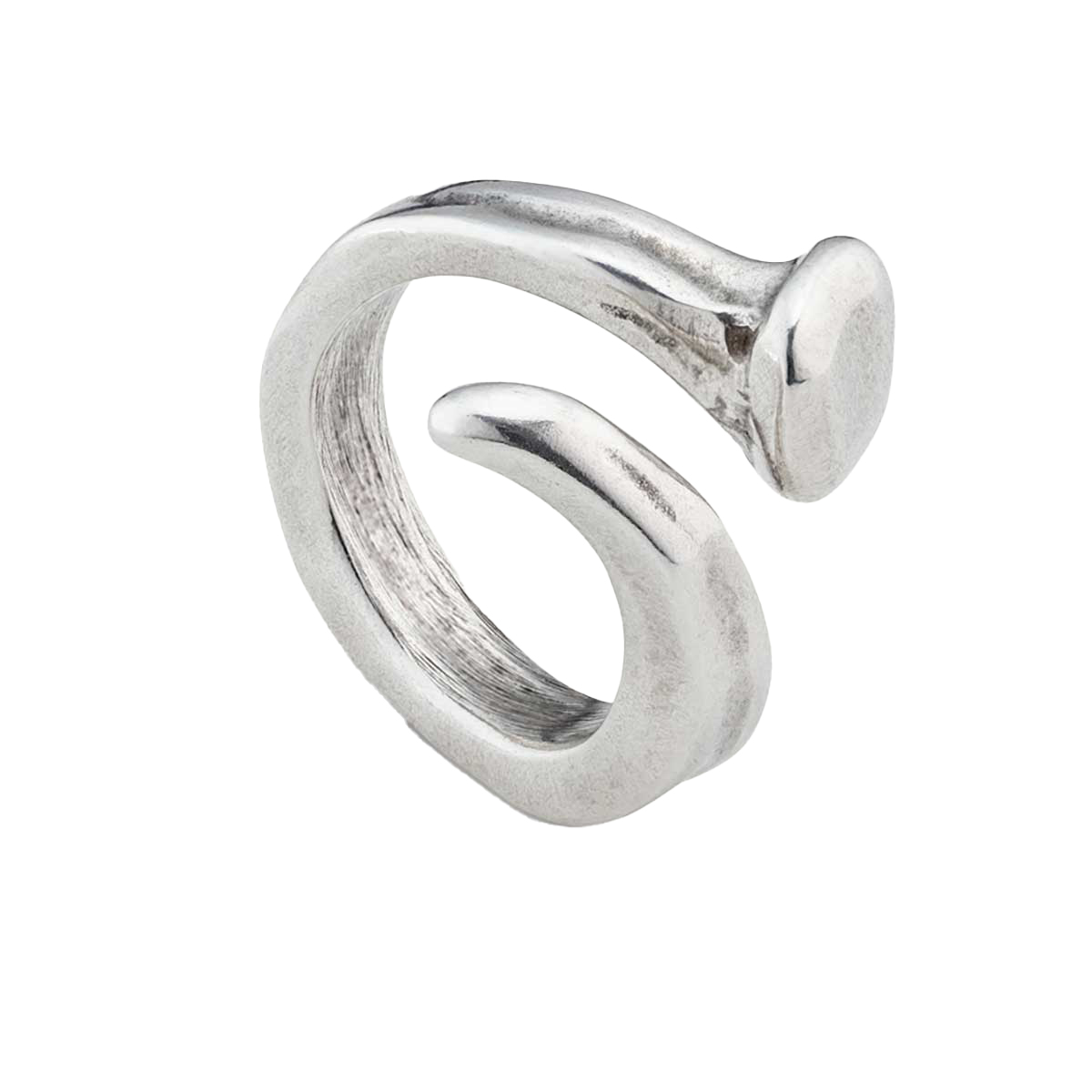 Легендарное посеребренное кольцо UNOde50 с оригинальным дизайном в виде гвоздя, почти согнутого в спираль. Незамкнутая форма придает украшению уникальный вид. Оно выдержано в бунтарском и смелом стиле UNOde50. Произведено в Испании, полностью ручная работа.