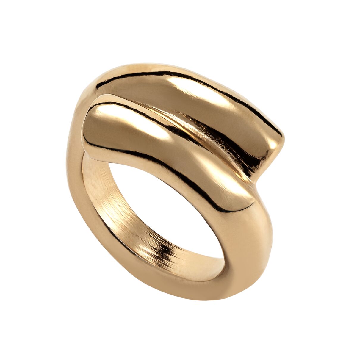 Кольцо в виде двух заполненных трубок, находящих одна на другую. Это кольцо изготовлено вручную в Испании с использованием ремесленных техник - от литья из металлического сплава до покрытия золотом в 3 микрона, вес кольца 11 г. Универсальный дизайн позволяет носить это кольцо с другими предметами из разных коллекций.