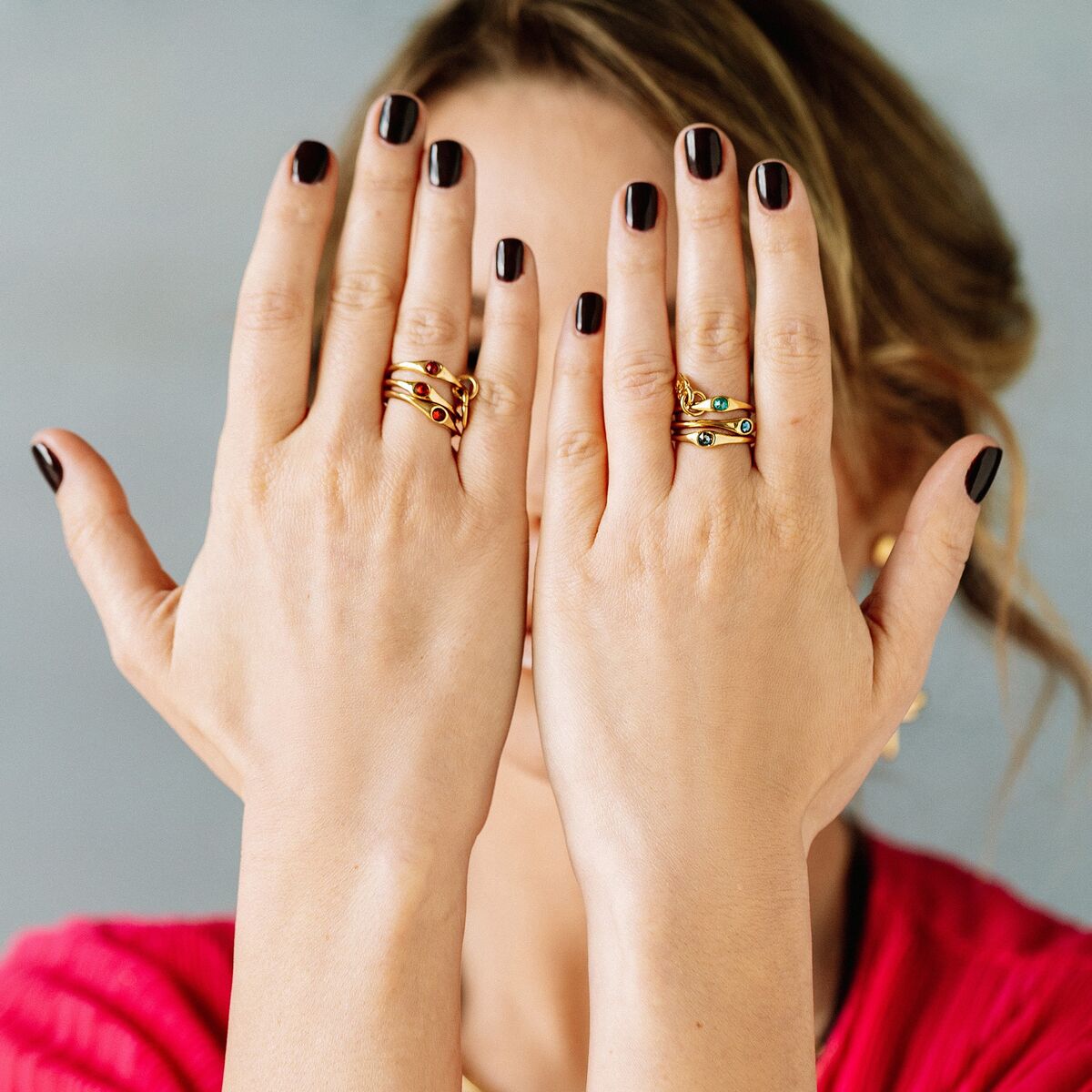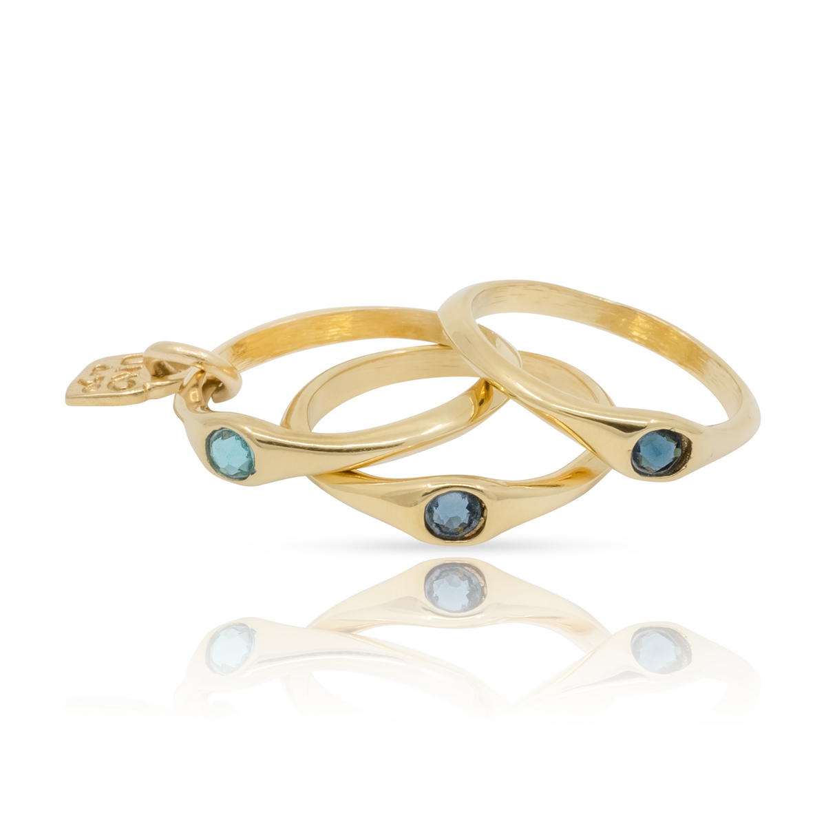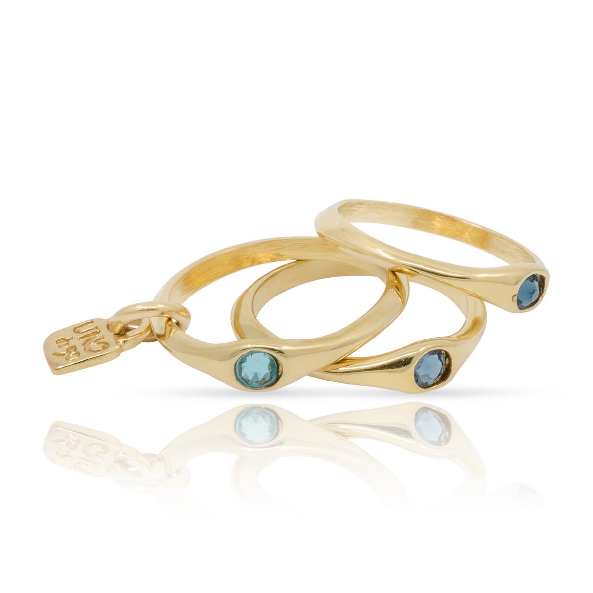 Комплект колец Happy blue с золотом из коллекции Freedom - стильный элегантный аксессуар. Украшение представляет собой три позолоченных кольца с удивительным кристаллом в каждом. Кольцо так же украшено фирменным замочком UNOde50. Создайте свой неповторимый и утонченный образ.