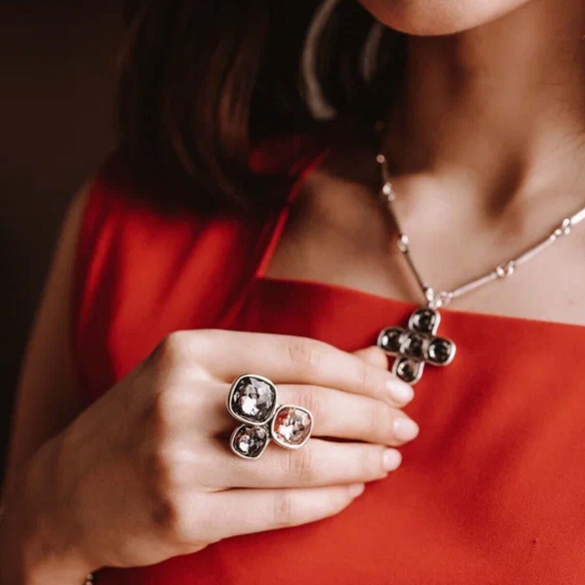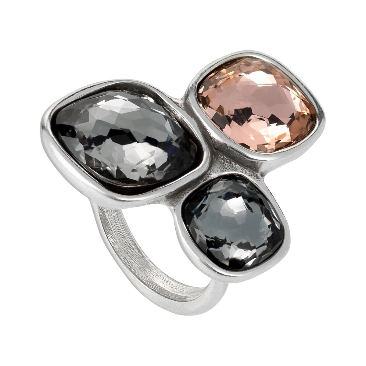 Женское кольцо украшено тремя необычными серыми и одним розовым кристаллами разного размера. Изготовленное вручную в Испании, это уникальное ювелирное изделие изготовлено вручную с использованием лучших материалов, от металлического сплава до посеребрения в 15 микрон. Оно весит 16 г. Носите это кольцо вместе с остальными изделиями из коллекции Fearless, чтобы сделать любое событие особенным.