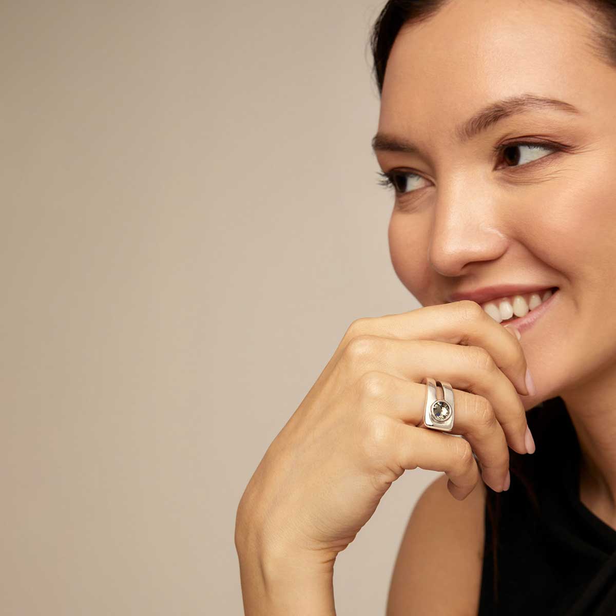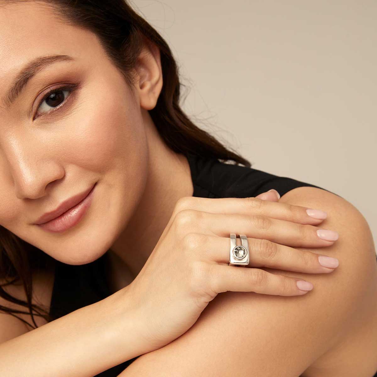 Эффектное кольцо On My Own с серебром - стильный аксессуар, символизирующий внутреннюю силу. Согнутое в круг звено в виде металлического прямоугольника словно застегнут на сверкающую «пуговицу», роль которого выполняет крупный серый кристалл круглой формы. Посеребрение уникального ювелирного сплава идеально сочетается с цветом кристалла. Благодаря ручной работе украшение оживает, передавая заложенные в нем смыслы. Быть собой, быть уверенной, быть независимой! Дополните кольцо серьгами арт. PEN0928GRSMTL и ожерельем COL1875GRSMTL с аналогичным дизайном, чтобы усилить впечатление.