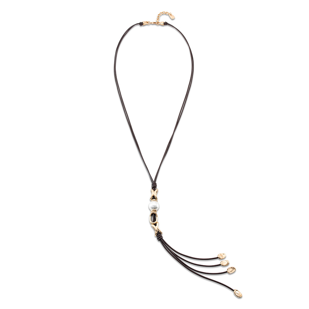Описание Женское ожерелье на коже с жемчугом и золотыми элементами длинное UNOde50 BOND