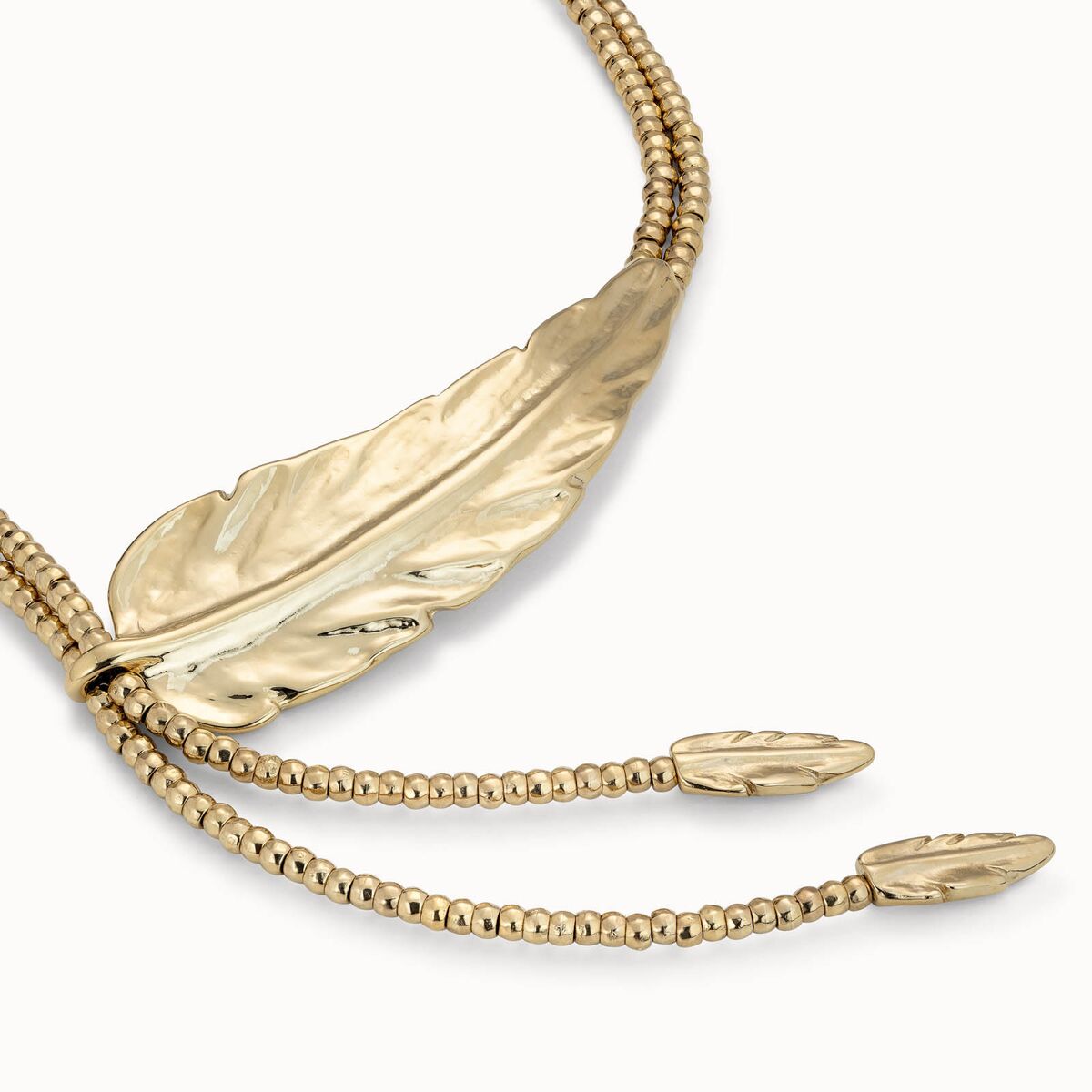 Позолоченное ожерелье, собранное из двойной нити бусин, которые заканчиваются двумя маленькими перьями. Ключевым элемент этого изделия является крупное закругленное перо, расположенное в левой части ожерелья. Это ювелирное изделие станет идеальным аксессуаром в этом сезоне. 100% изготовлено вручную в Испании из металлического сплава и покрыто золотом в 3 микрона.