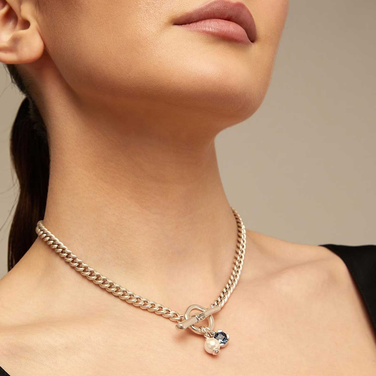 Продемонстрируйте высокий стиль и утонченный вкус с ожерельем Two Expearltional с серебром. Эксклюзивный дизайн украшения превращает его в настоящий арт-объект. Аксессуар, изготовленный из посеребренного ювелирного сплава, представляет собой укороченную цепочку из средних, плотно соединенных друг с другом звеньев. Застежка превращена в центральный элемент и состоит из крупного кольца и планки с фирменной гравировкой. Главный акцент - две нежные подвески: одна в виде жемчужины, другая в виде голубого граненого кристалла. Изделие ручной работы с уникальным дизайнерским решением создано, чтобы подчеркнуть вашу индивидуальность.