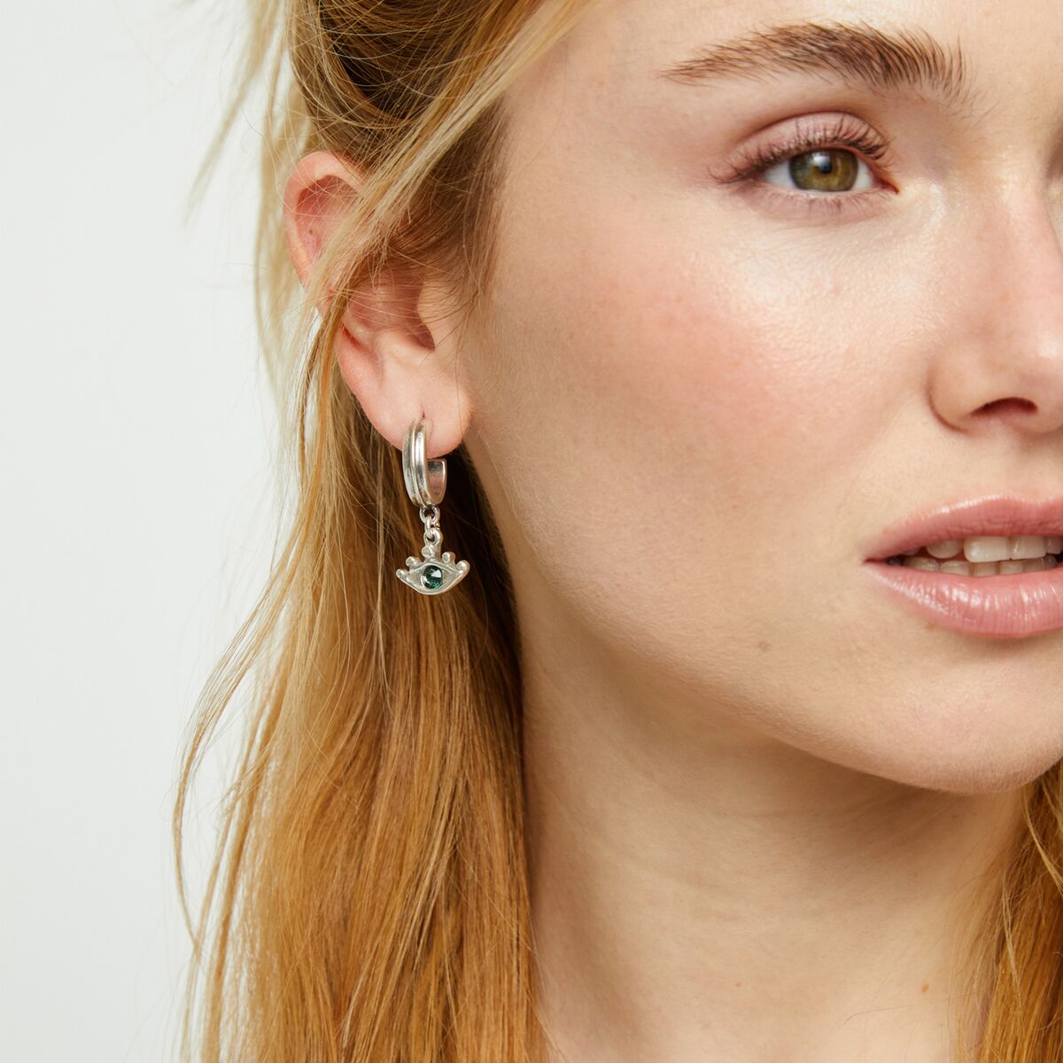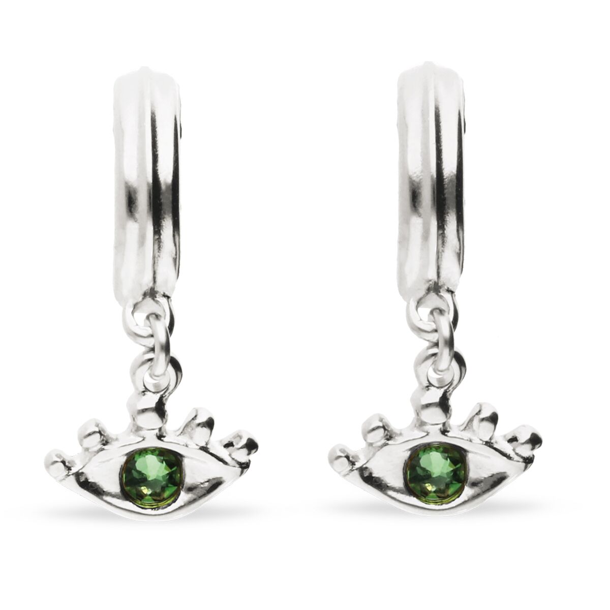 В центре каждой серьги сияет зелёный кристалл, переливающийся оттенками молодой листвы и солнечных бликов, как взгляд, полный весёлых искорок и тайных признаний. Оправа нежно обнимает камень, придавая ему лёгкий холодок лунного света и подчёркивая его свежесть.