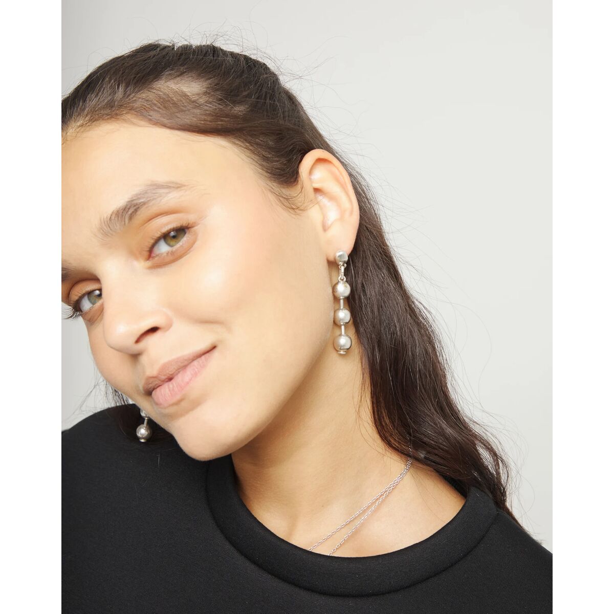 Серьги выполнены из металлических бусин из сплава с серебрянным покрытием. Подвижная конструкция задает динамику, а застежка-гвоздик надежно фиксирует украшение в ухе. Серьги легко впишутся в любые образы и станут напоминанием о ценности паузы — той самой, в которой рождаются трепетные чувства.