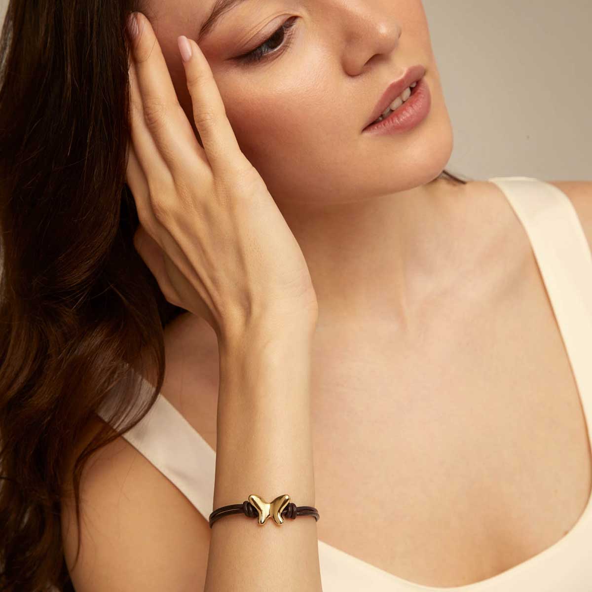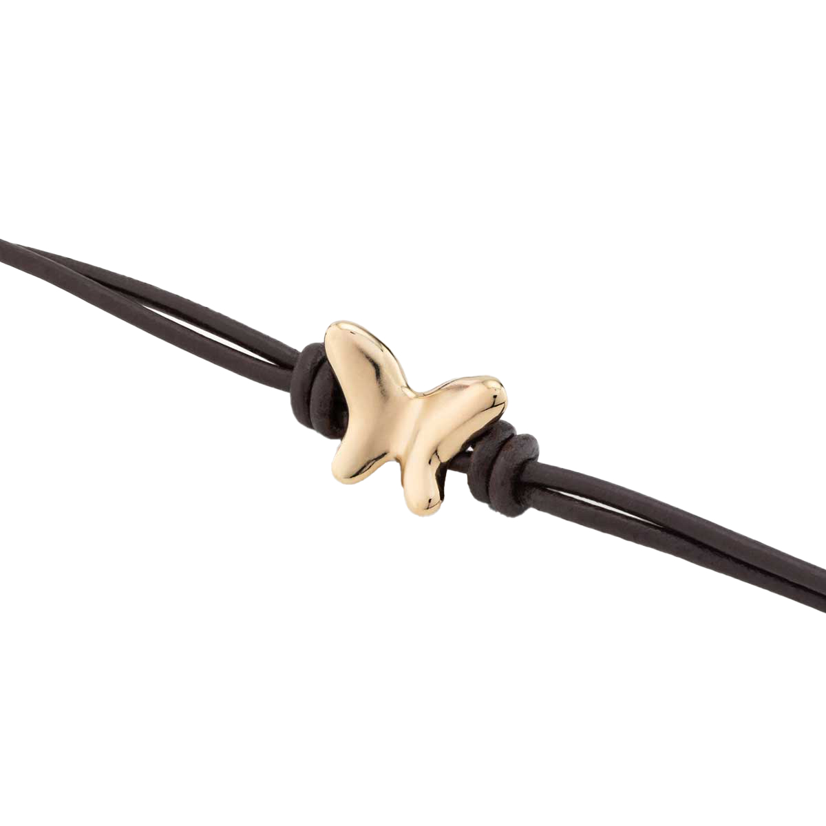 Изящный браслет Volare - идеальный выбор для тех, кто ищет стильное, выразительное, элегантное украшение. Два тонких кожаных шнурка темно-коричневого цвета образуют ремешок браслета, удерживая центральный элемент - миниатюрную филигранную бабочку, сверкающую позолотой. Сочетание темной кожи и яркого блеска позолоченного ювелирного сплава дает яркий контраст, так уместный для праздничного наряда и создающий привлекающий внимание акцент для повседневного образа. Эксклюзивный аксессуар выполнен с использованием ремесленных техник и 100-процентной ручной работы, что придает ему особенный шарм.