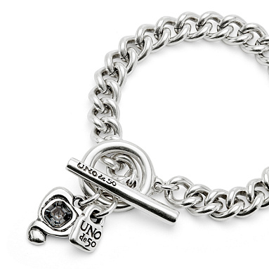 Откройте для себя мир высокого стиля с браслетом Ser Expresiva с черным кристаллом, с серебром. Ручная работа, уникальный сплав, авторский дизайн превращают этот аксессуар в эксклюзивное произведение искусства. Браслет представляет собой массивную цепочку, центральным элементом которой выступает креативная застежка в виде крупного кольца и планки. Кольцо украшено двумя подвесками: фирменным замочком UNOde50 с гравировкой и граненным кристаллом, заключенным в изящную оправу, напоминающую сердце. Современный характер украшения делает его идеальным акцентом как для повседневных, так и для вечерних образов. Этот браслет — великолепный выбор для тех, кто ценит стиль и оригинальность.