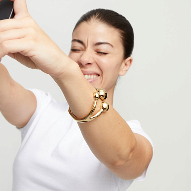 Проявите свое творческое начало с помощью браслета Ser Intrepida с золотом. Неординарный авторский дизайн аксессуара, изготовленного вручную из уникального сплава, привлекает внимание и вызывает восхищение. Жесткий браслет состоит из плавных текучих линий, увенчанных тремя гладкими сферическими элементами. Футуристическая форма изделия создает ощущение, что это настоящее произведение искусства. Выбор такого аксессуара — идеальный способ раскрыть свою индивидуальность и продемонстрировать художественный вкус.