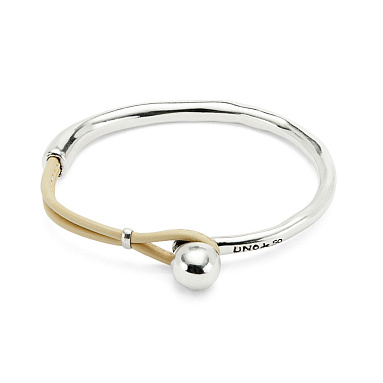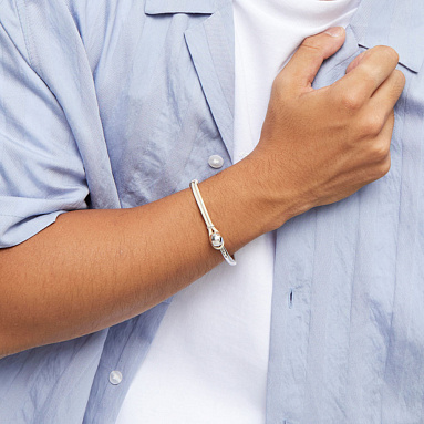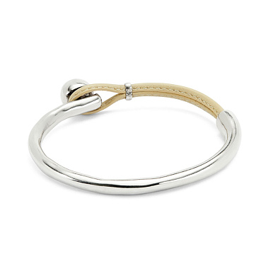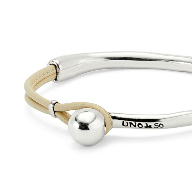 Будьте смелее в выражении своей индивидуальности, выбрав неординарный аксессуар — браслет Ser Intrepida с серебром и бежевой кожей. Аксессуар, изготовленный вручную из уникального сплава, представляет собой разомкнутое кольцо, которое завершается участком кожаного ремешка нежного бежевого цвета. Текучие линии сверкающего серебрением металла контрастируют с мягкой текстурой и приятным оттенком кожи. Креативная застежка, в которой кожаная петелька накидывается на металлическую шляпку, служит центральным элементом, добавляющим украшению оригинальности. Фирменная гравировка UNOde50 подчеркивает эксклюзивность изделия. Нетривиальный авторский дизайн украшения будет привлекать внимание, куда бы вы ни отправились, и позволит проявить свою творческую натуру.