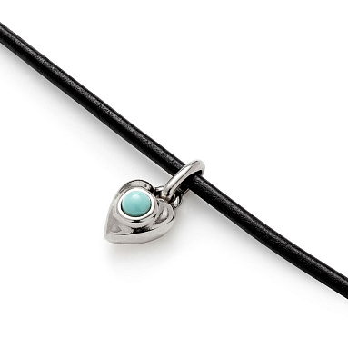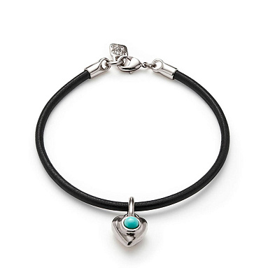 Кожаный браслет с подвеской в форме сердца, с серебром и бирюзой, из коллекции SER UNICO — стильный аксессуар, творчески раскрывающий тему любви. Изделие представляет собой шнурок из черной кожи с застежкой-карабином. Центральным элементом выступает шарм в виде сердечка из посеребренного сплава, декорированного бирюзой. Культовый замочек UNOde50, украшающий застежку, подчеркивает эксклюзивность украшения ручной работы. Сочетание кожи, металла и камня создает органичную композицию, привлекающую внимание. Креативный авторский дизайн браслета подчеркнет вашу индивидуальность и безупречный вкус.