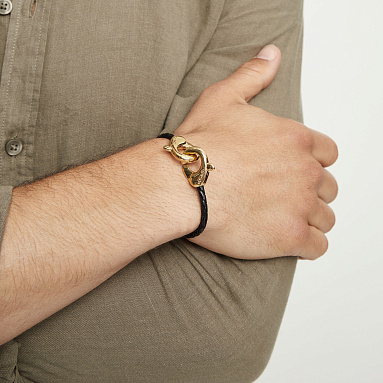 Плотный кожаный ремешок и акцентный позолоченный карабин создают выразительное сочетание фактур и смыслов. Мягкое сияние позолоты контрастирует с матовой кожей, подчеркивая характер владельца — уверенного, но не показного. Этот браслет о внутренней стойкости, спокойствии и чувстве меры.