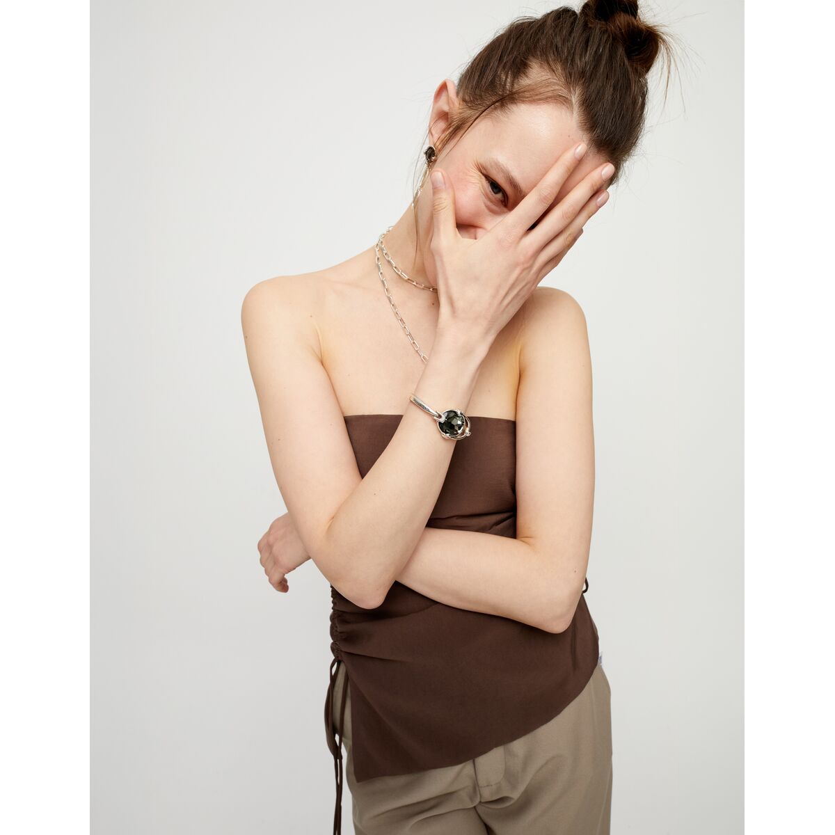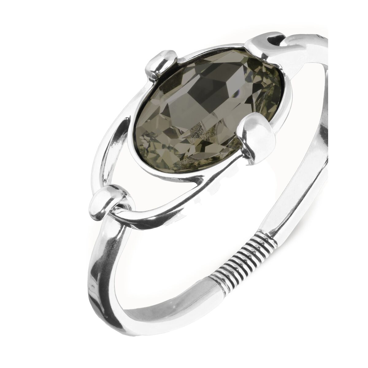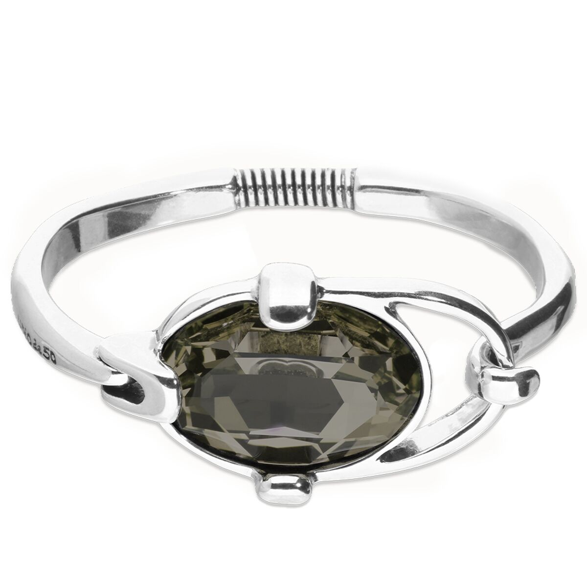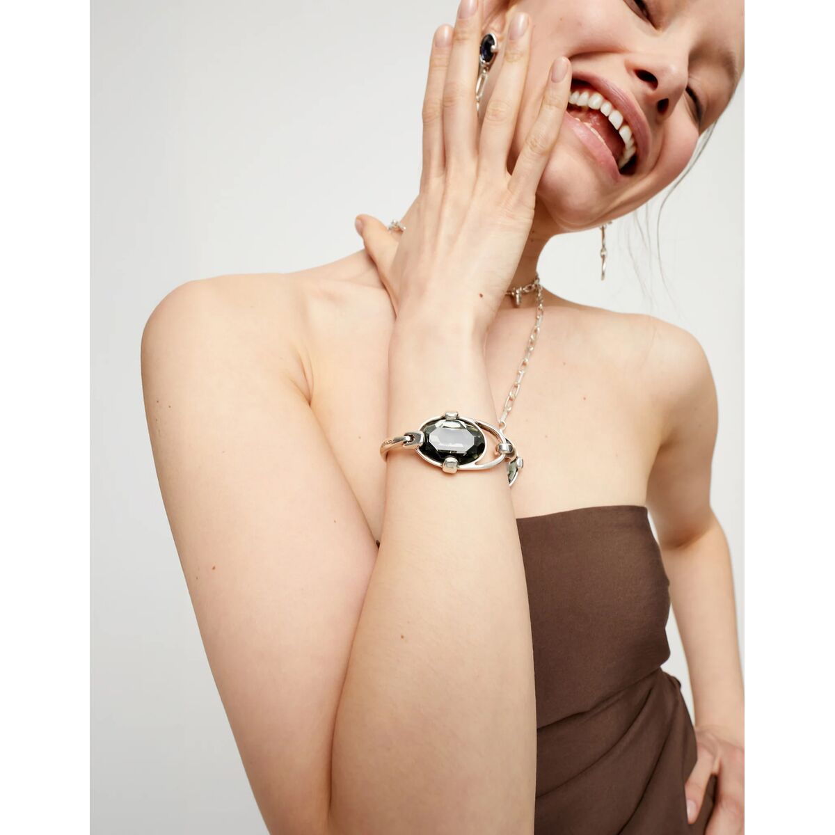 Этот дизайнерский браслет выделяется своей прочной и полированной структурой, обрамляющей загадочный граненый кристалл глубокого графитово-серого тона.