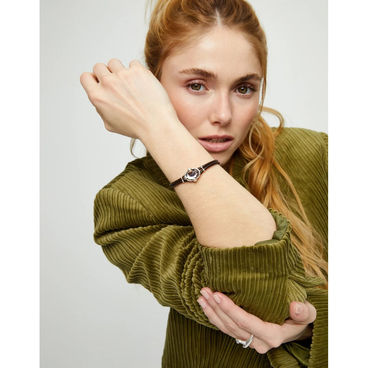 Это уникальное украшение сочетает в себе двойной коричневый кожаный ремешок, который придает изделию деревенский и прочный вид, с центральным элементом, обрамляющим нежный розовый граненый кристалл.