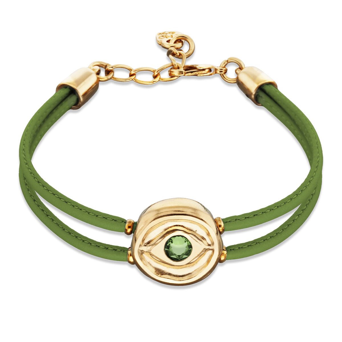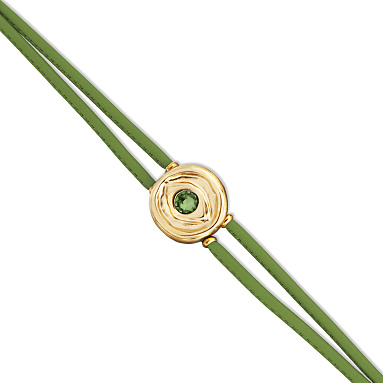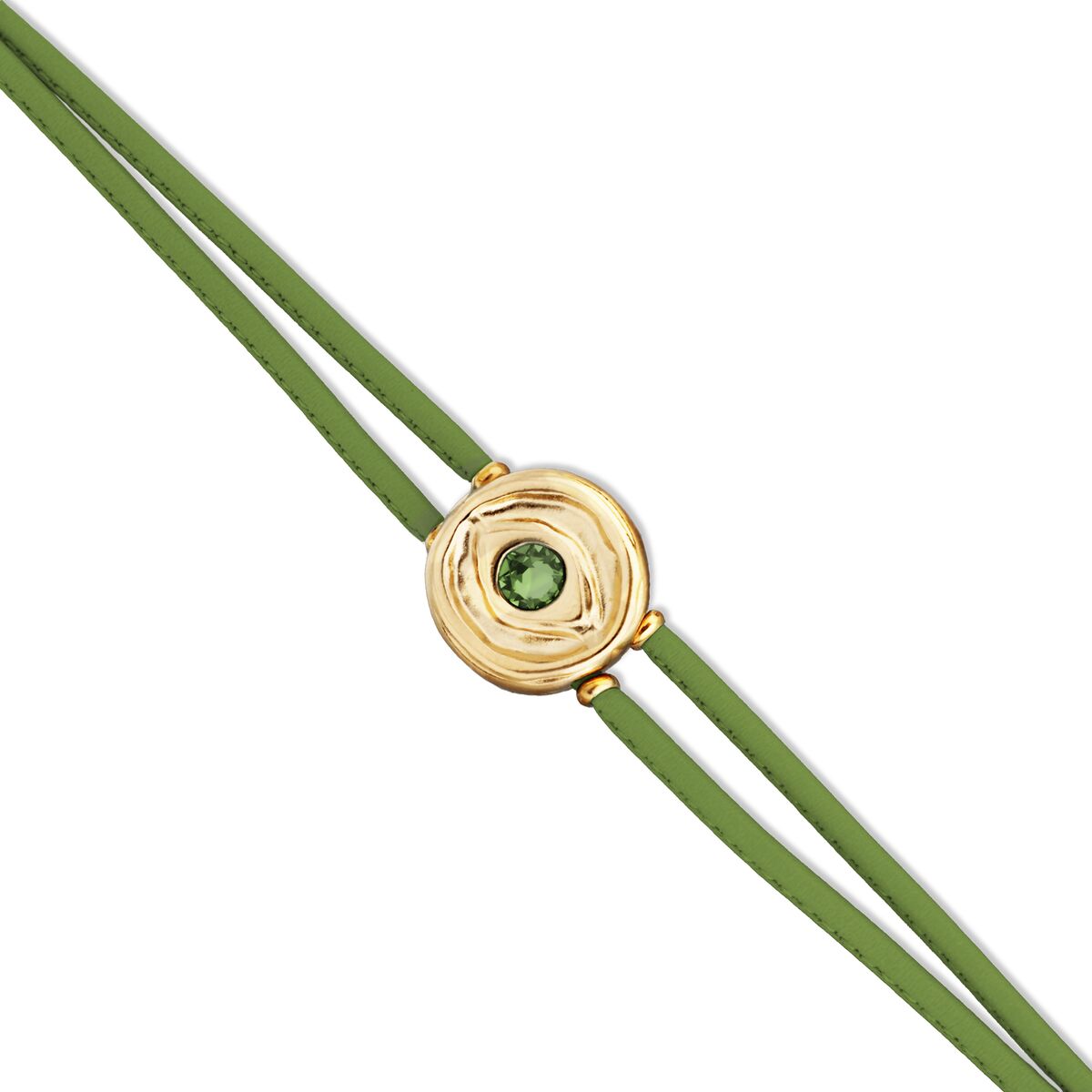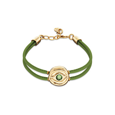 В центре браслета мерцает зелёный кристалл, глубокий и чарующий, словно взгляд, полный обещаний и непроговорённых слов. Его переливы дразнят своим насыщенным сиянием, пробуждая воображение и заставляя сердце биться быстрее при одном только движении.