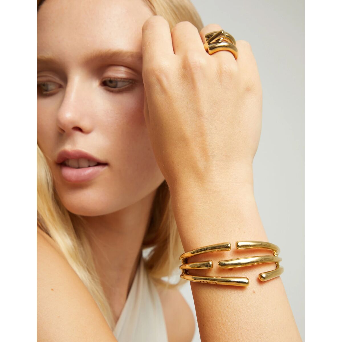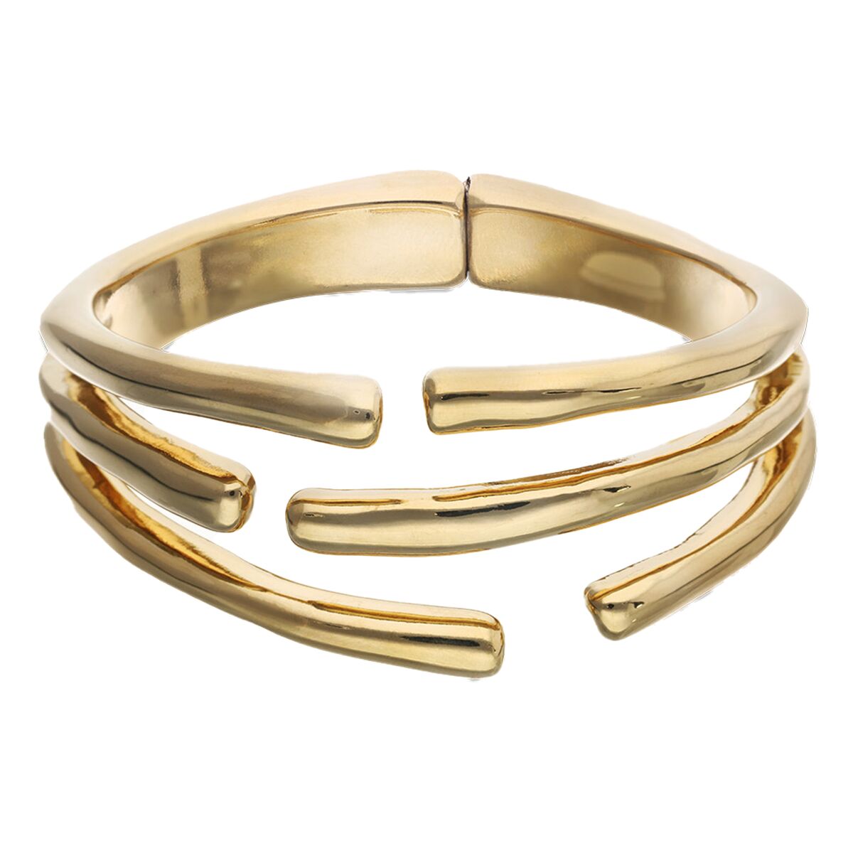 Браслет изготовлен из металла с позолотой и отличается прочностью и удобной посадкой на запястье. Тройная конструкция создает эффектный визуальный рисунок, а гладкая рельефная поверхность выгодно подчеркивает позолоченное покрытие.