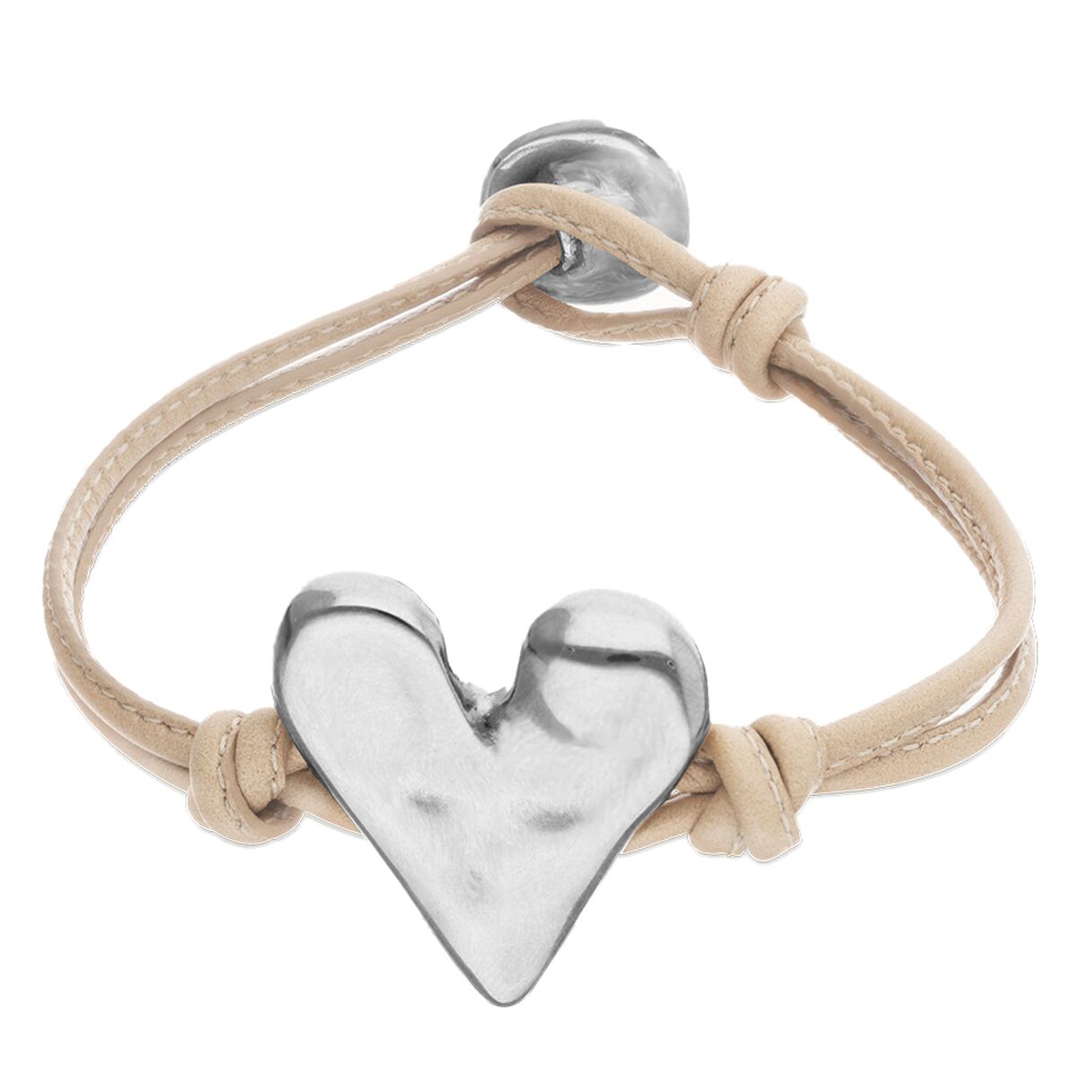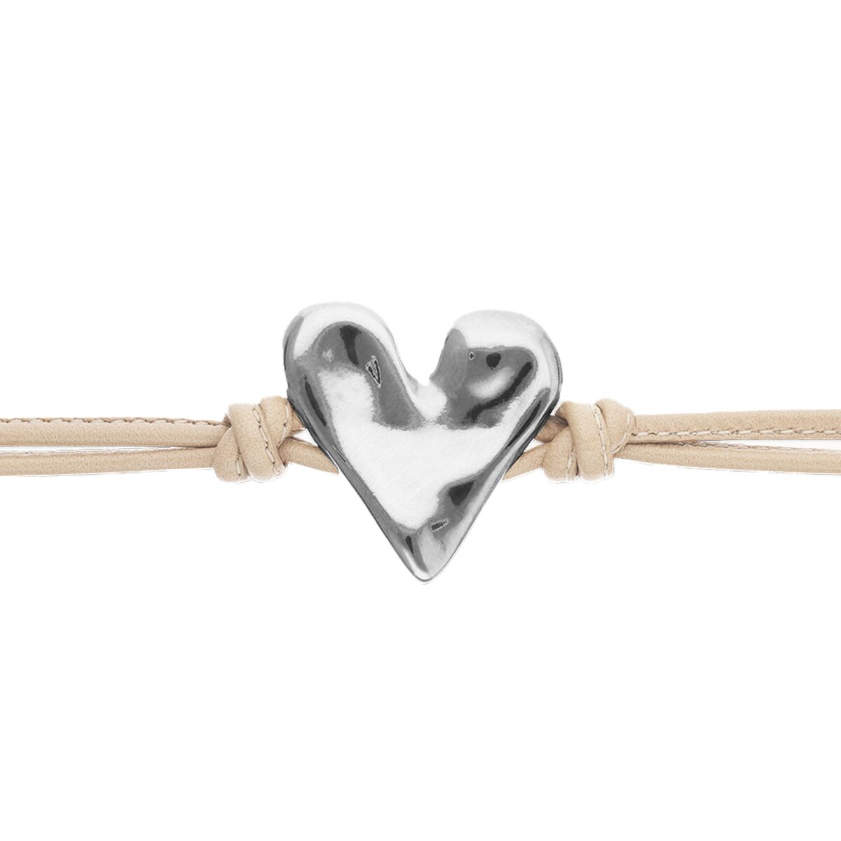 Браслет выполнен из натуральной кожи теплого бежевого оттенка и дополнен сердцем из сплава с серебрением. Неровная, живая форма подчеркивает ручную работу и делает каждое украшение уникальным. Кожаный ремешок удобно садится на запястье и подходит для ежедневной носки. Браслет легко впишется в повседневные образы и станет вашим символом привязанности — к себе, к чувствам, к собственному ритму.