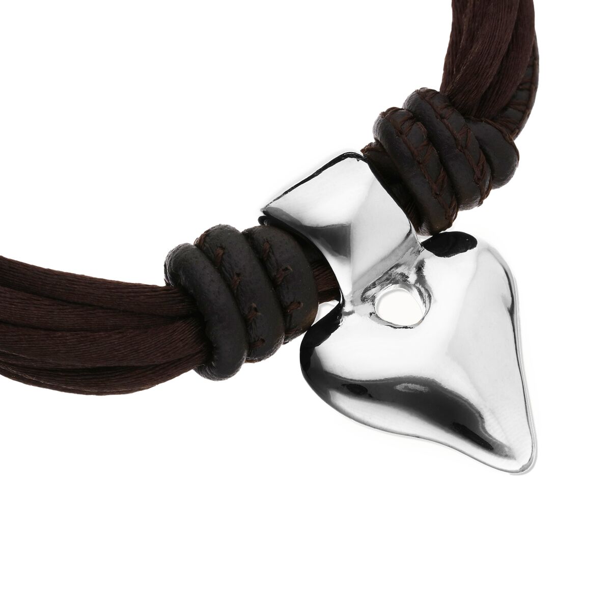 Украшение выполнено вручную из натуральной кожи и дополнено металлической деталью в форме сердца из сплава с серебряным покрытием. Браслет подойдет для повседневной носки и станет символом уникальности вашей истории.