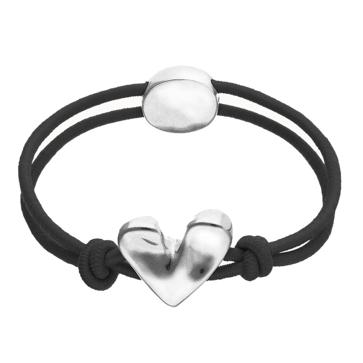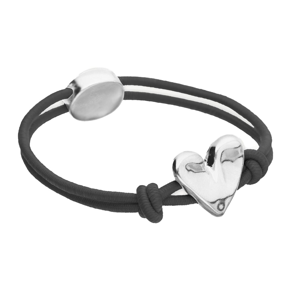Браслет выполнен из прочного текстильного шнура и дополнен металлической деталью в форме сердца из сплава с серебрянным покрытием. Украшение изготовлено вручную и подойдет для повседневных образов.