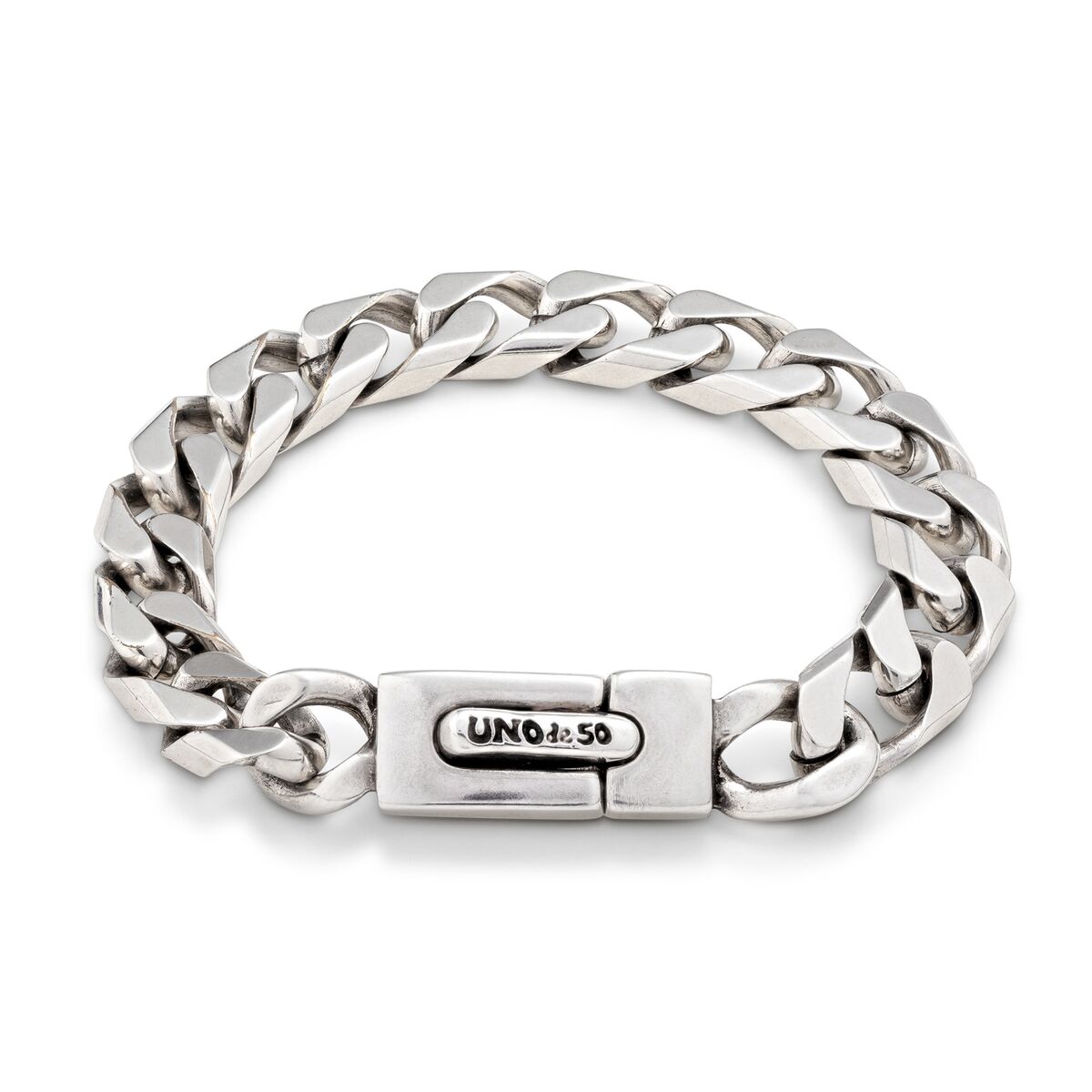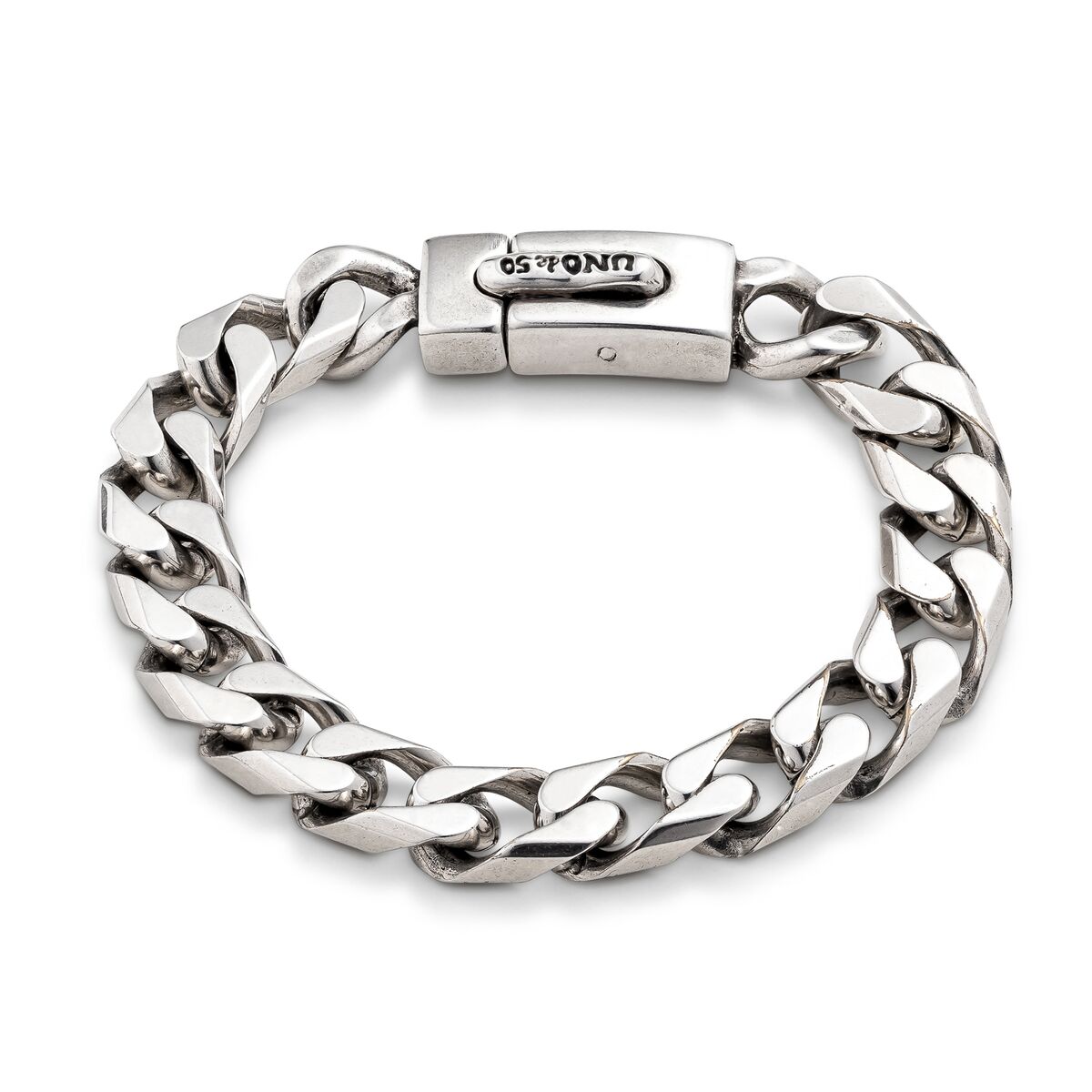 Браслет Sharp из массивной плоской цепи оригинального плетения и стильной застежкой с брендовой гравировкой. Ручная работа из Испании с использованием посеребренного металлического сплава. Порадуйте себя этим браслетом, изготовленным с использованием уникальных ремесленных техник, которые отражают суть UNOde50.