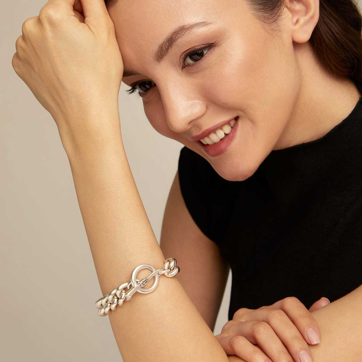 Станьте иконой стиля благодаря браслету Electric с серебром. Изготовленный из уникального ювелирного сплава аксессуар представляет собой цепочку из массивных крученых звеньев с серебрением. Авторский дизайн превращает застежку в центральный элемент украшения в виде крупного кольца с планкой, на которую нанесена фирменная гравировка. Дополните браслет ручной работы ожерельем арт. COL1836MTL0000U в таком же дизайнерском решении, чтобы создать безупречный образ.