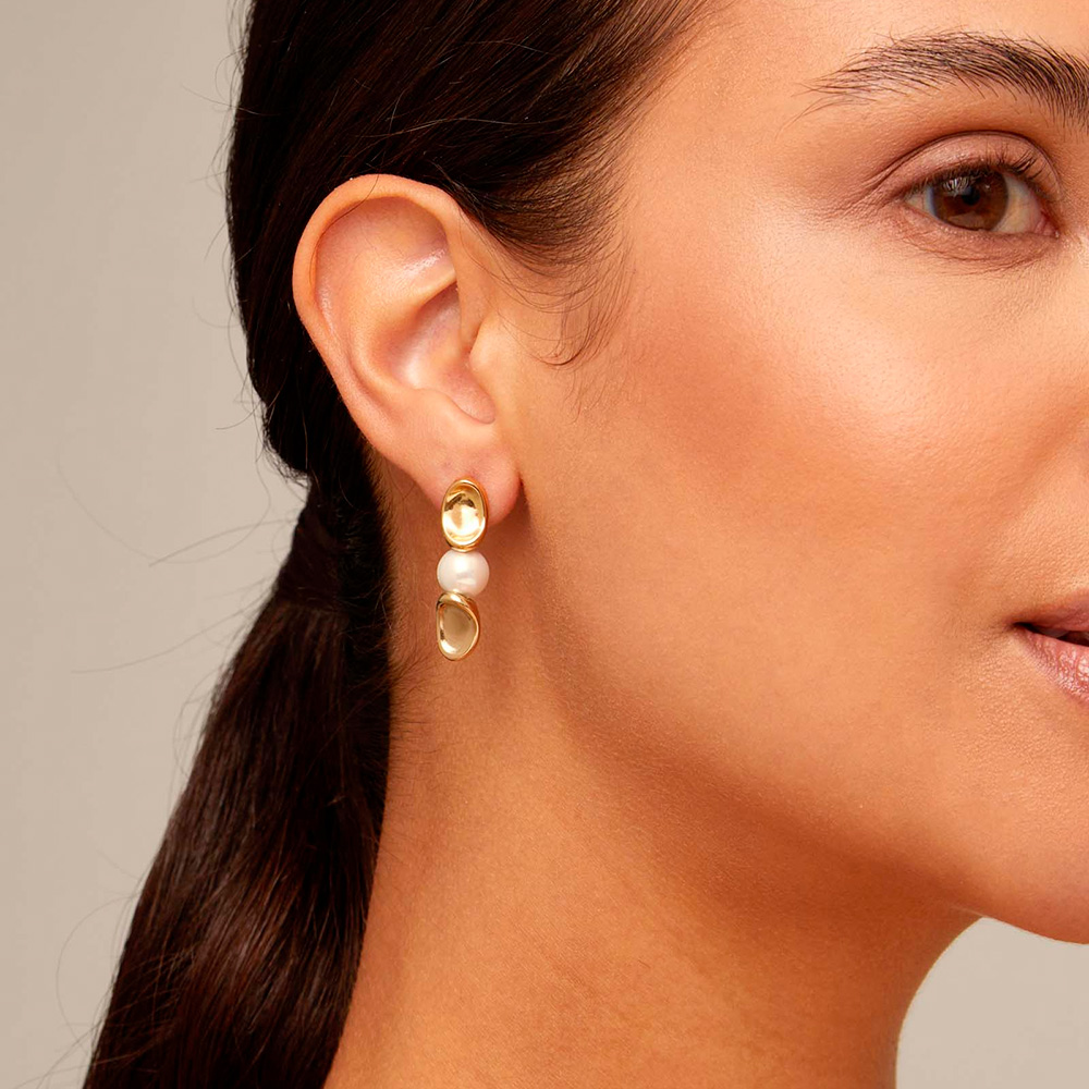 Утонченные серьги с золотом – это уникальное украшение, которое сделает ваш образ особенным. Крупные речные жемчужины, занимающие центральное место в дизайне аксессуара, соединяют выполненные из позолоченого сплава элементы, стилизованные как створки пресноводной раковины. Удивительная композиция украшения словно предлагает прикоснуться к первозданной природе, являющей нам такое чудо, как формирование жемчуга. Серьги идеально подходят для создания нежных, светлых, легких образов. 100-процентная ручная работа.